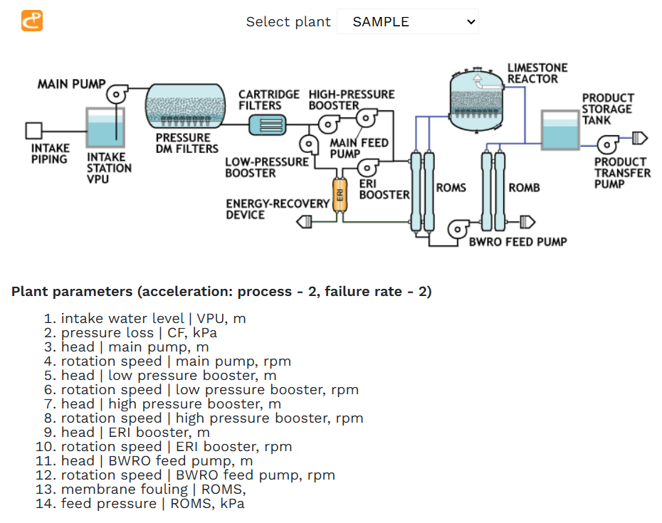 The main elements of the web interface for the plant predictive performance model visualization are shown below. When the user selects the plant, the plant PFD pops up. It contains all the elements of the PPM.